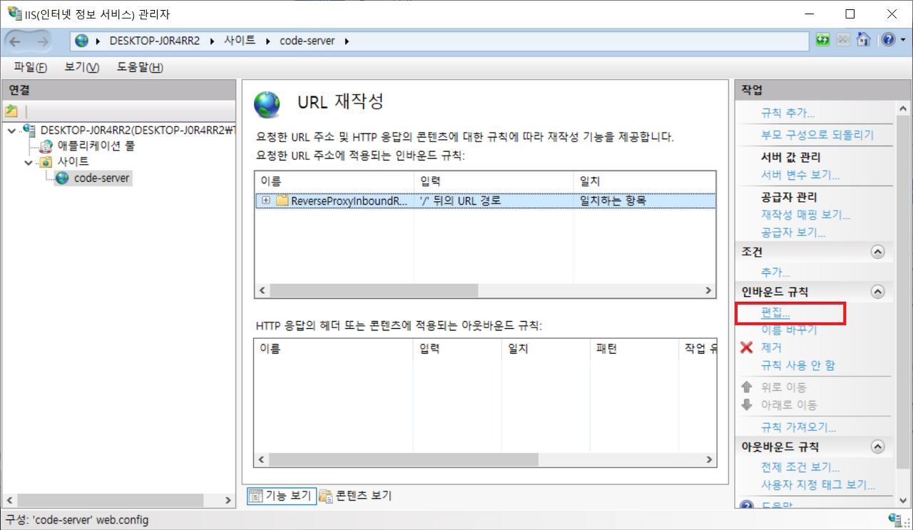 14. 방금 만든 규칙을 선택하고, 인바운드 규칙에서 편집을 눌러 편집 창으로 들어간다. |
