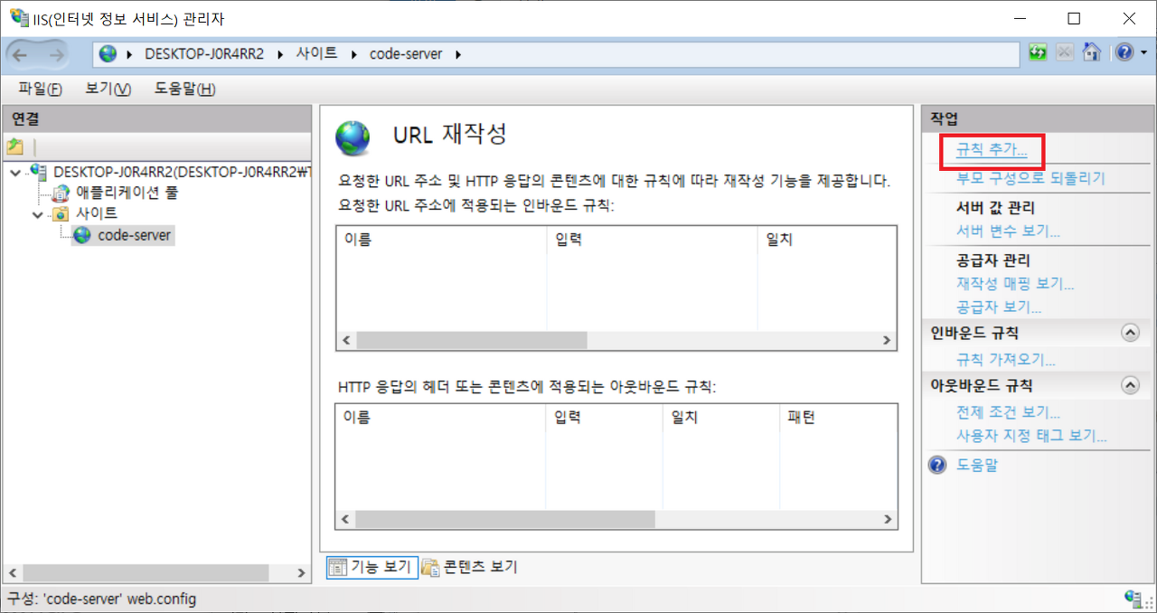 역방향 프록시용 규칙이 들어가는 web.config가 해당 컨텐츠 경로에 저장됨.