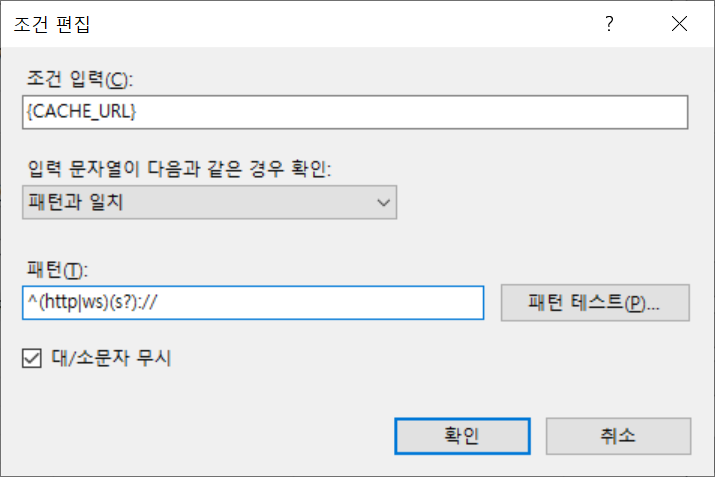16. 사진처럼 URL스키마를 (http|ws)(s?) 로 수정. ※ http, ws 이외에 다른 스키마도 사용한다면, 그것들도 추가. 17. 고쳤으면 확인 클릭. 이후 규칙에서도 오른쪽의 작업 섹션에서 저장을 클릭해서 저장시킴. |