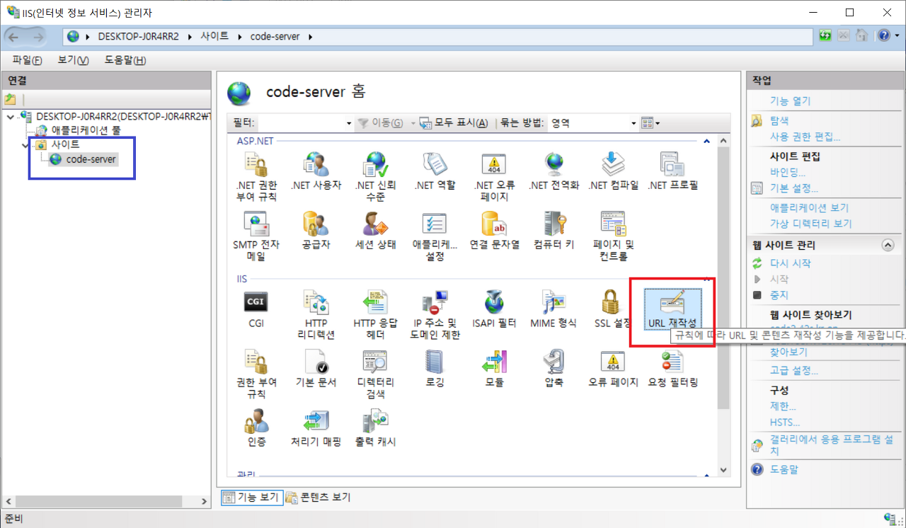6. 조금 전에 만든 사이트를 선택. 7. 그런 다음, URL 재작성 옵션으로 들어감. |