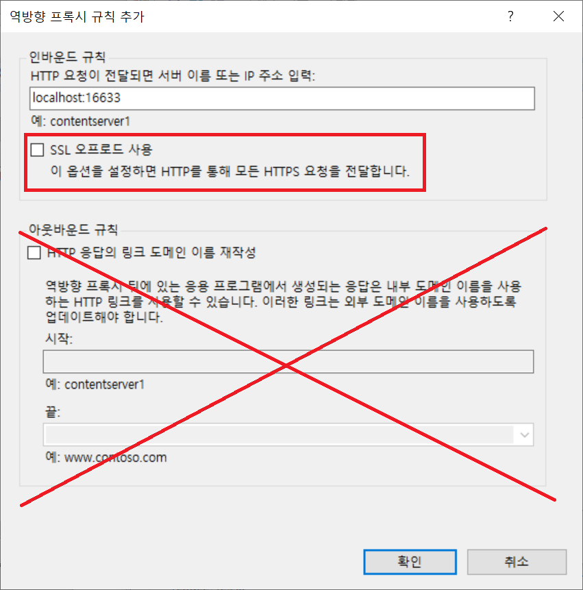 ※ 규칙 추가 창의 아래쪽에 있는 아웃바운드 규칙은 활성화 시키지 않는다. 인바운드 규칙에서 요청을 전달할 대상으로 주소 및 포트 번호를 모두 입력해준다. 또한, 여기서는 https,wss -> http,ws 규칙을 만들 예정이므로, SSL 오프로드 사용 규칙을 반드시 해제한다. 모두 설정을 마쳤다면, 확인을 눌러 저장한다. |
