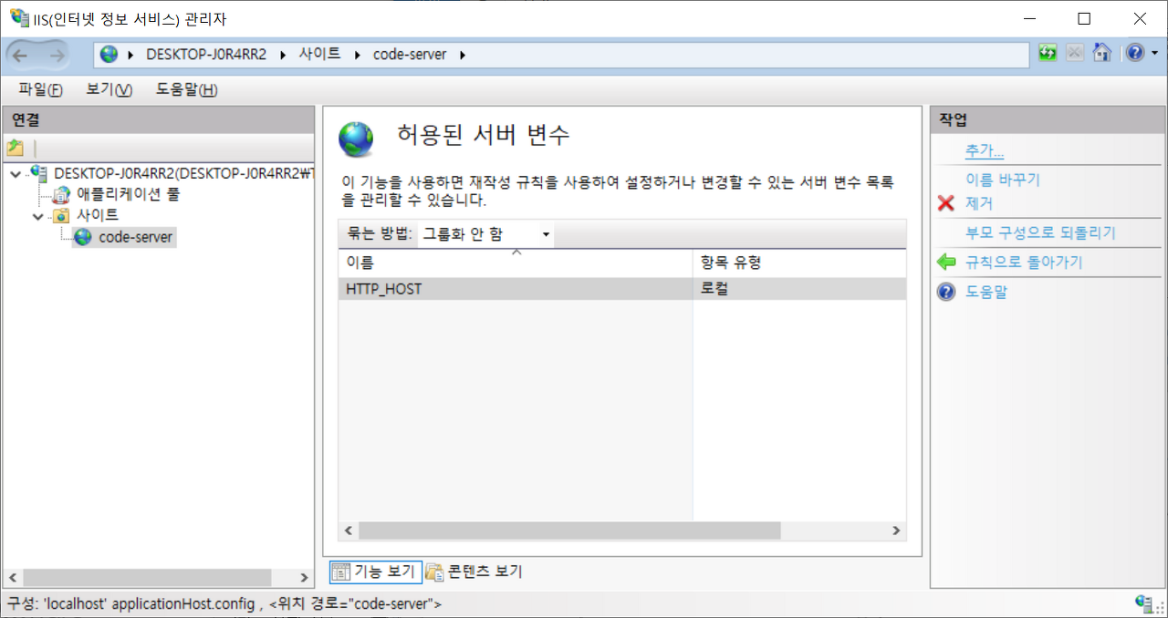 9. 추가를 눌러 HTTP_HOST 이름의 서버 변수를 추가. 10. 추가했으면 규칙으로 돌아가기를 선택해서 돌아가기. |