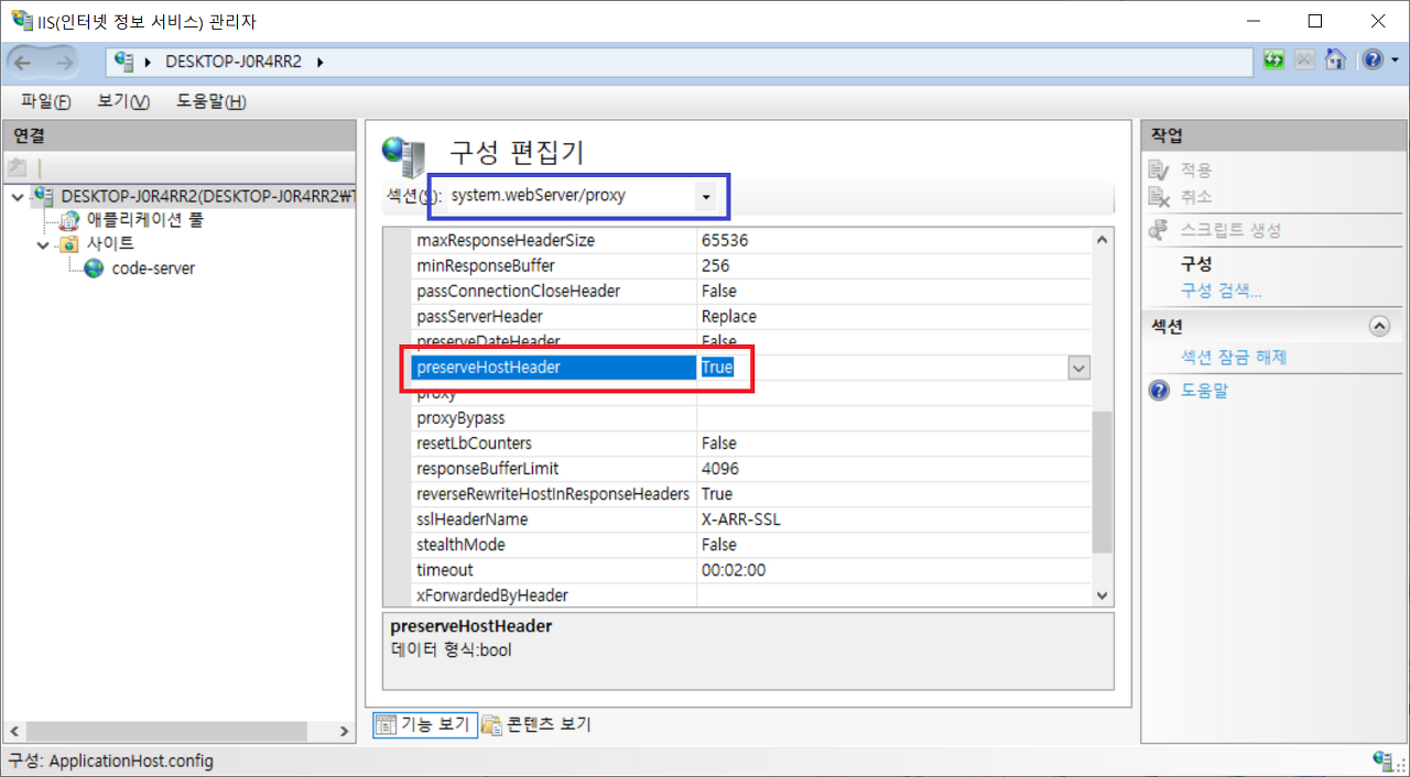 3. 섹션은 system.webServer/proxy 로 선택. 4. preserveHostHeader 옵션을 찾아서 True로. 5. 이후 오른쪽 작업 탭의 적용을 눌러 저장. |