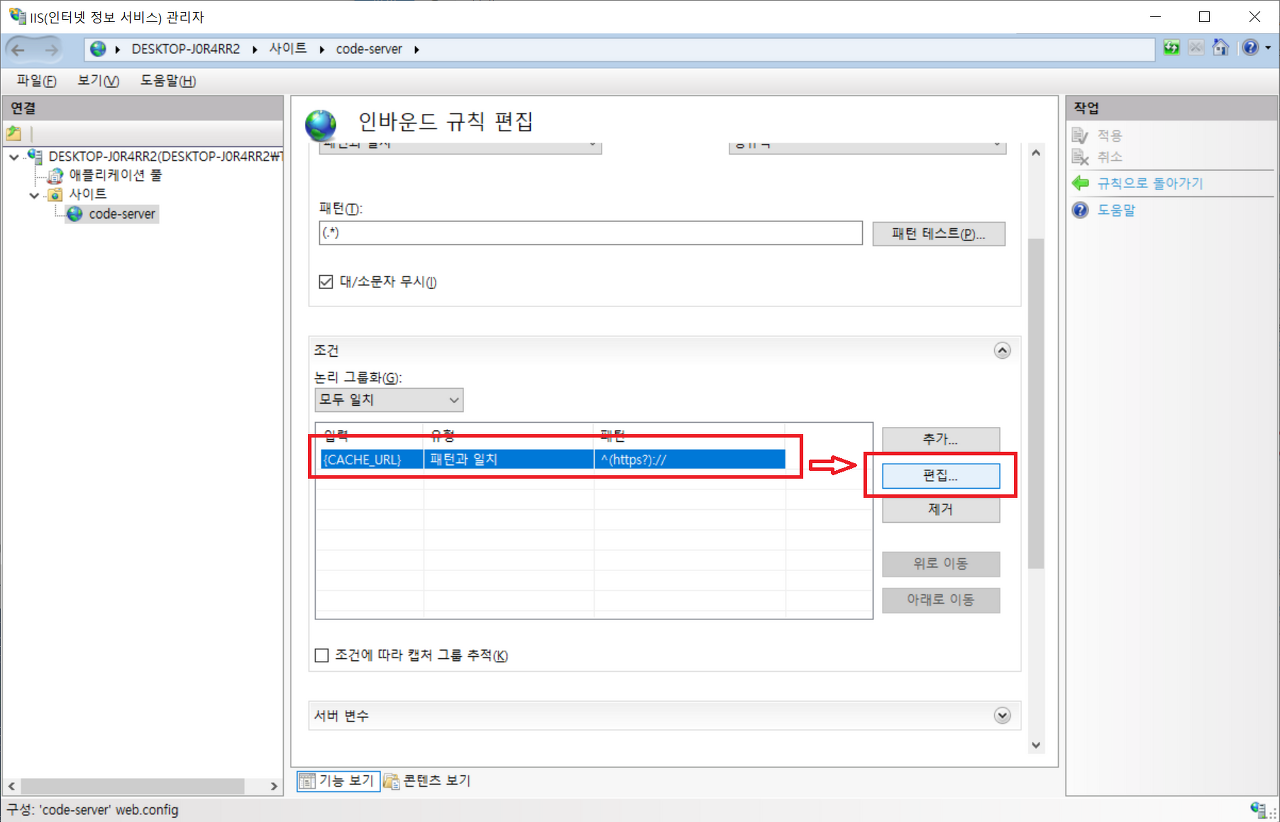 14. 방금 만든 규칙을 선택하고, 인바운드 규칙에서 편집을 눌러 편집 창으로 들어간다. |