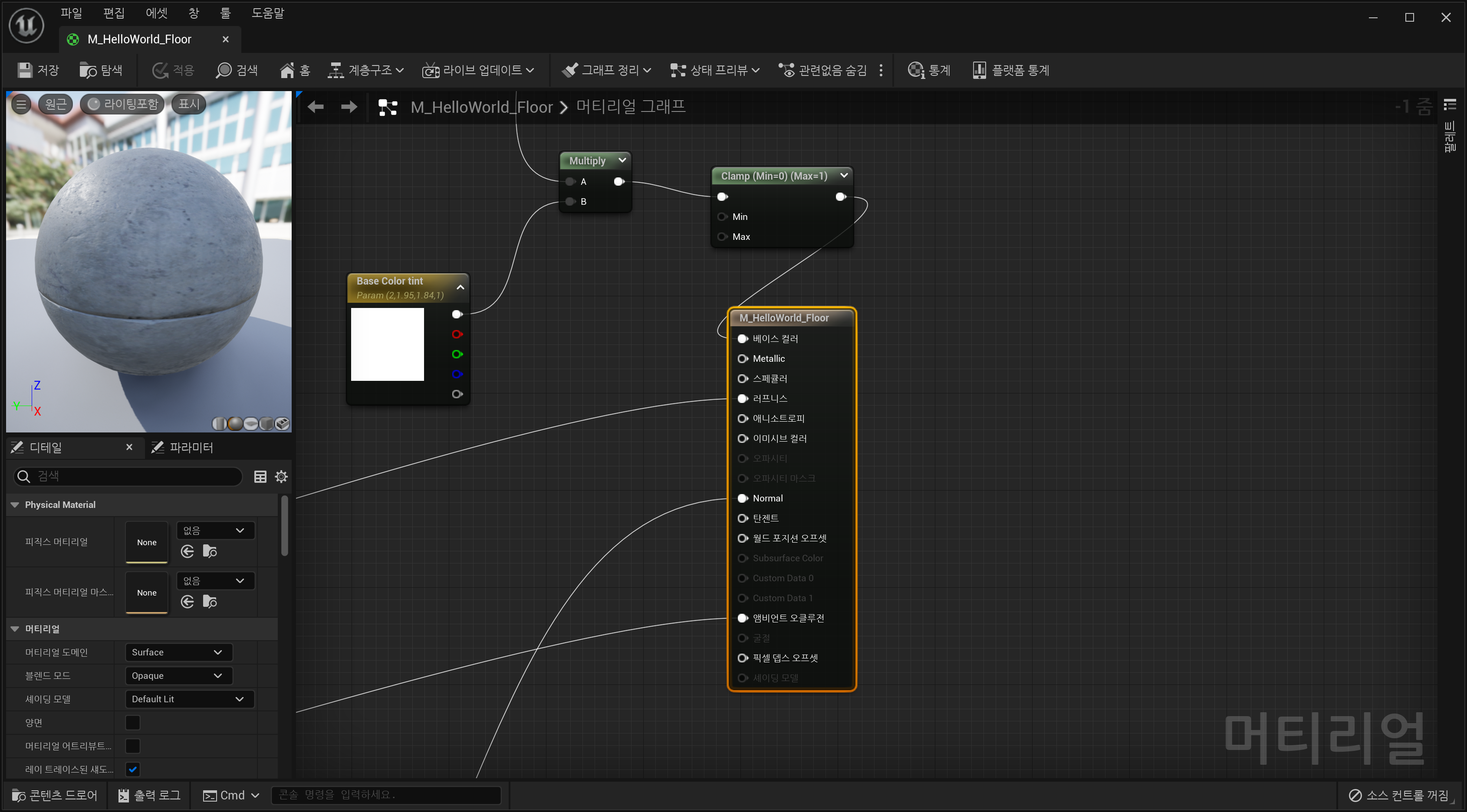 위와 같이 M_HelloWorld_Floor 이라는 이름의 머티리얼로 복제하였다. 다음, 해당 머티리얼을 더블클릭하여 편집창을 열었다.