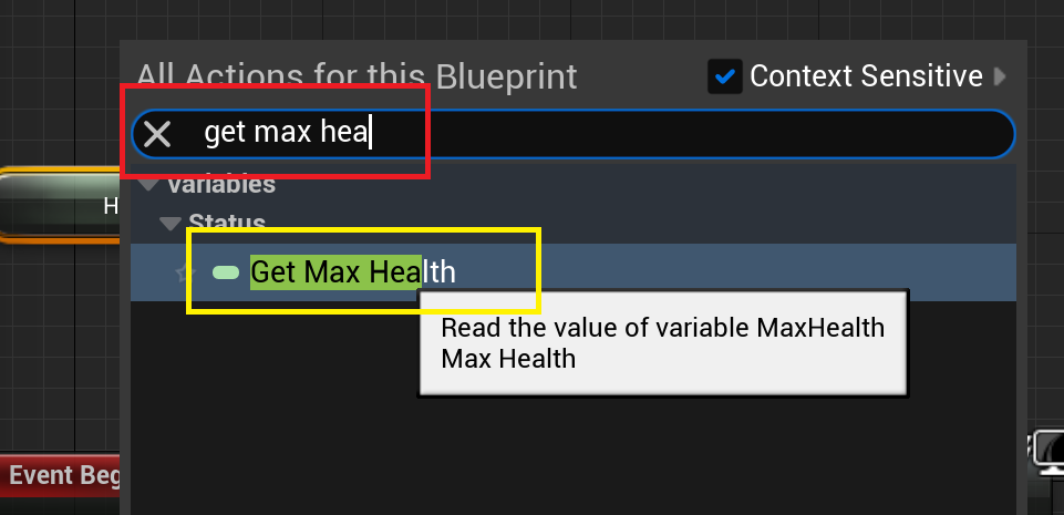 대충 get max hea 까지면 쳐도, Get Max Health라는 블루프린트 액션이 검색된다.