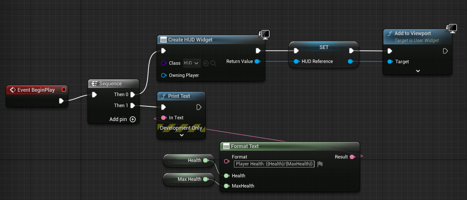 다음과 같은 레퍼런스를 참고하여서, Health 및 MaxHealth를 게임 시작시에 출력하는 블루프린트를 작성했다.