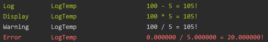 UE_LOG(LogTemp, Warning, TEXT("%d / %d = %d!"), Number, 5, Number + 5);