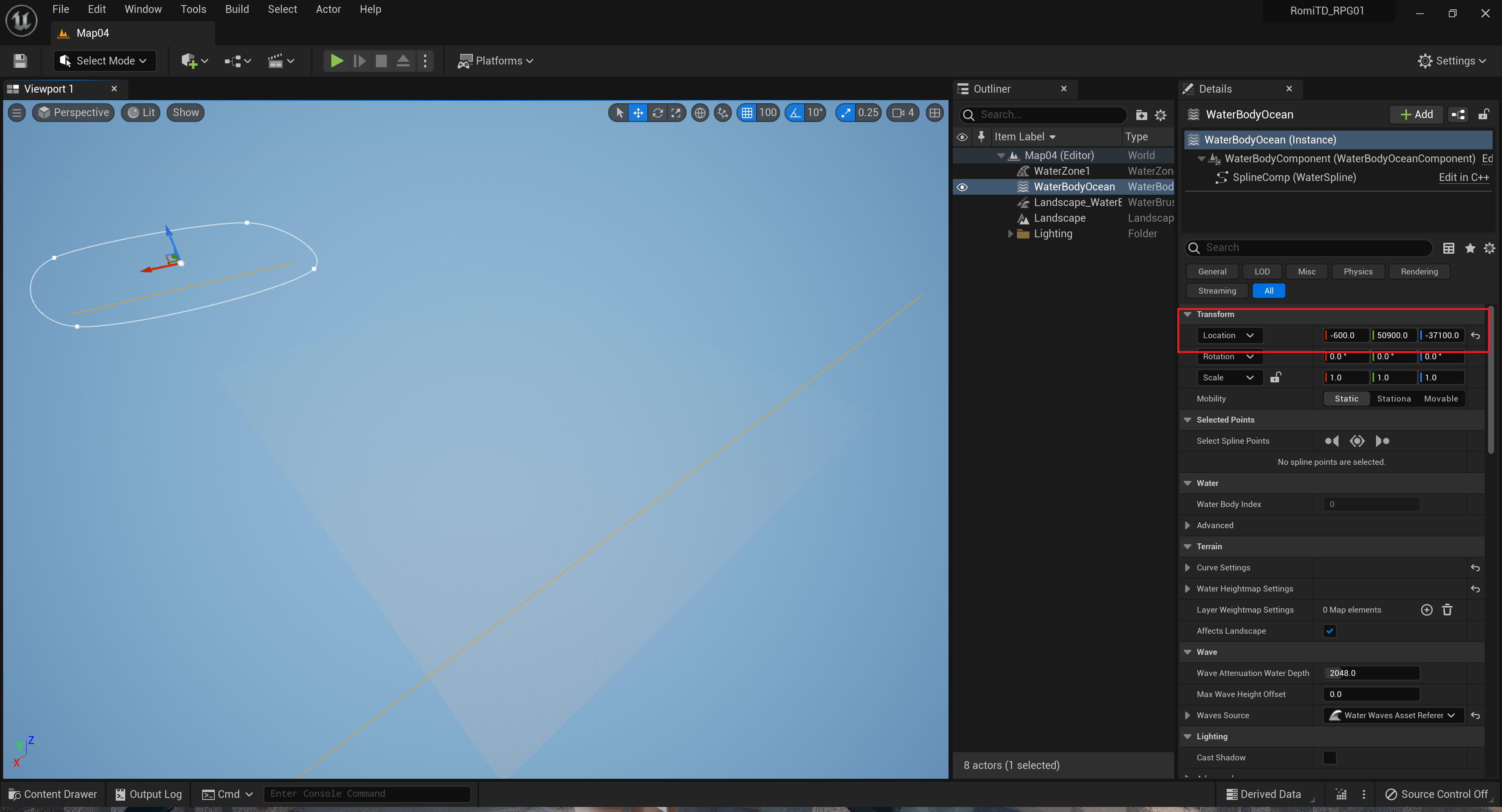 WaterBodyOcean 액터를 Landscape 액터가 있던 좌표로 우선 맞추어주었다.