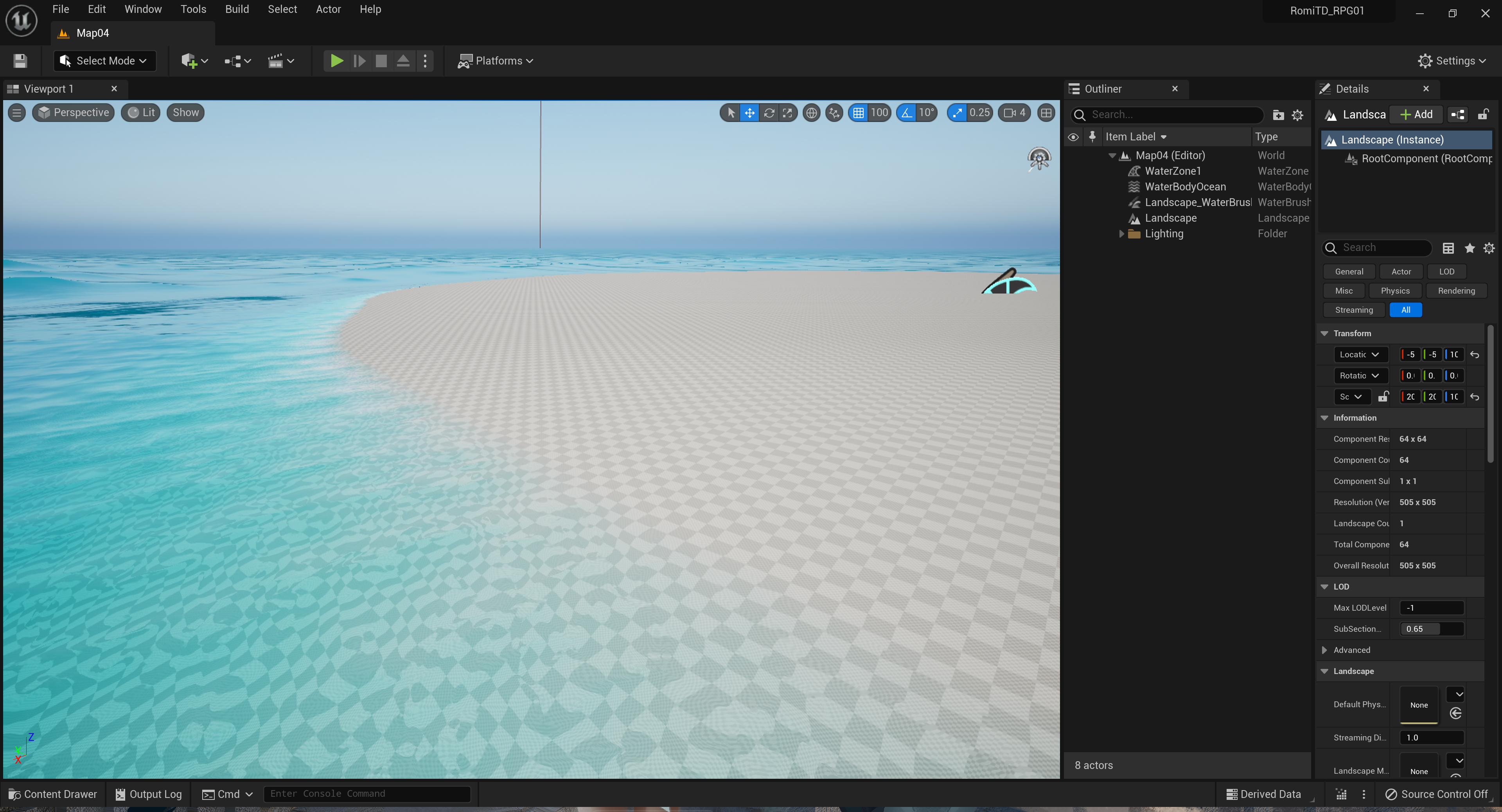 씬에 WaterBodyOcean 및 부가 요소들이 추가되었으나, 뭔가 이상하다. 이를 해결해주기 위해, 먼저 Landscape 액터를 눌러본다.