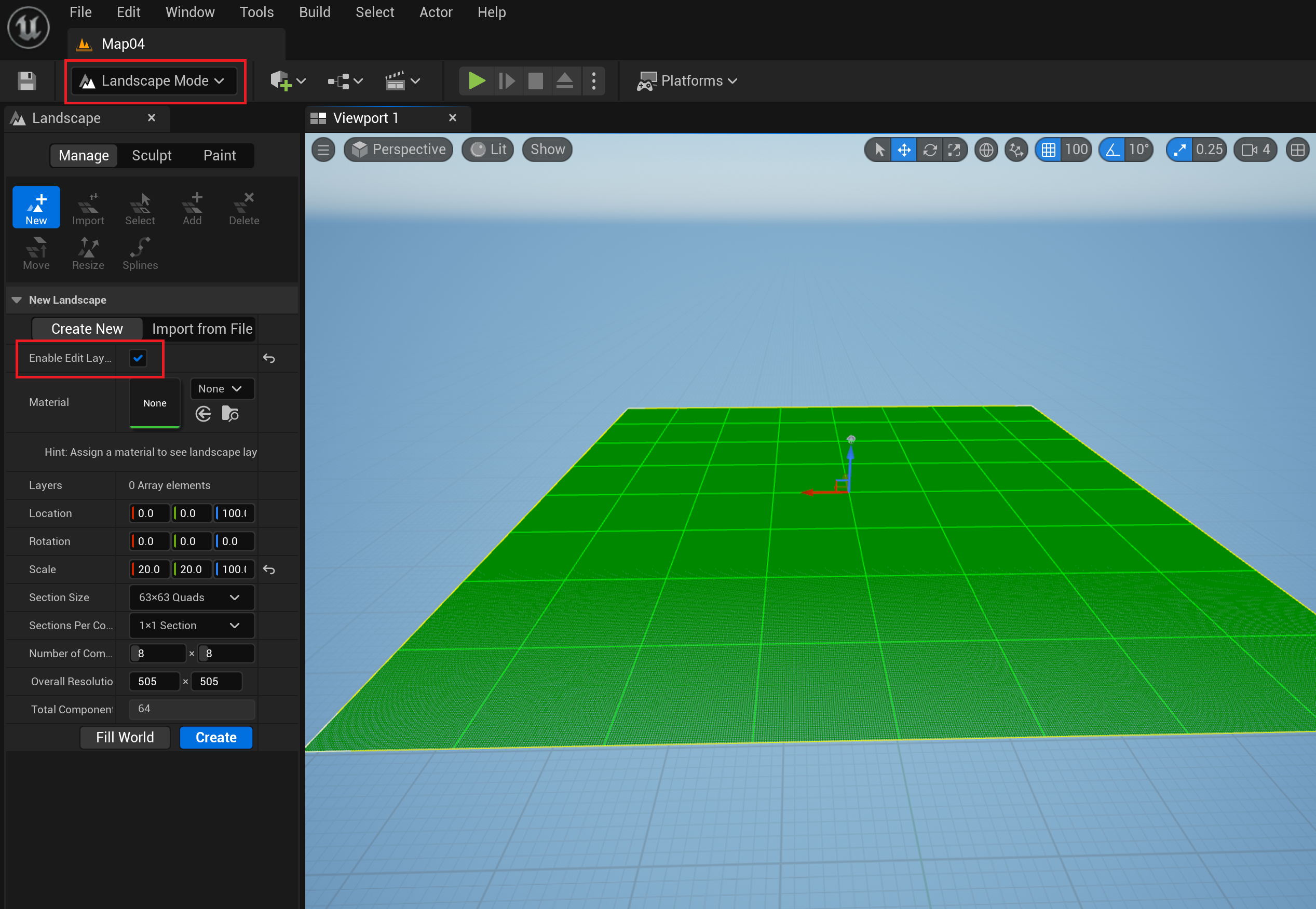 Landscape 액터는 -5040.0, -5040.0, 100.0 좌표에 있으며, 씬 내에서 위치는 사진과 같다.