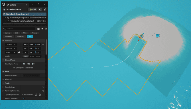 이와 같이 WaterBodyRiver의 위치 및 Spline Point를 옮겨주는 것으로 간단하게 강 제작까지 완성!