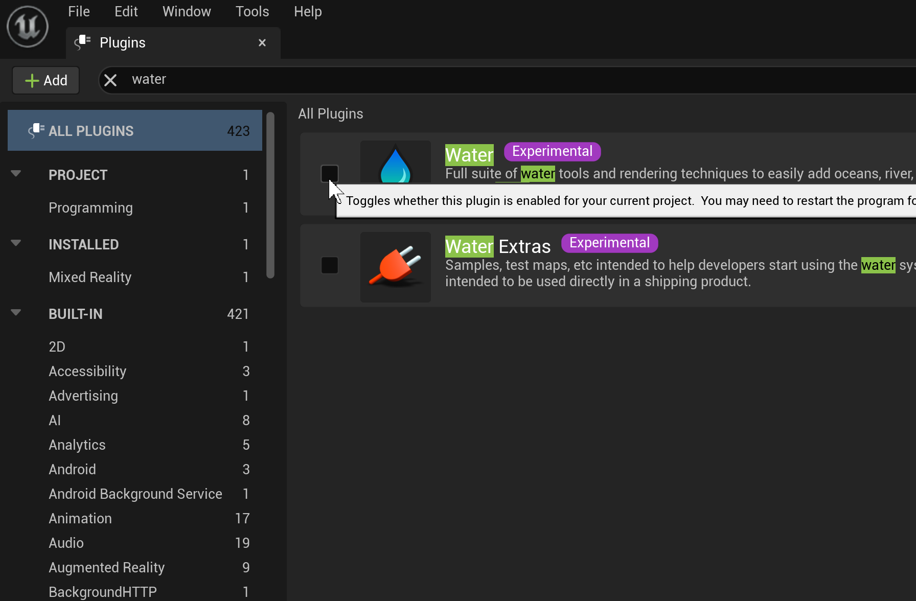 검색 창에 Water를 검색하고, 결과에서 옆에 체크 표시를 눌러서 플러그인을 설치한다.
